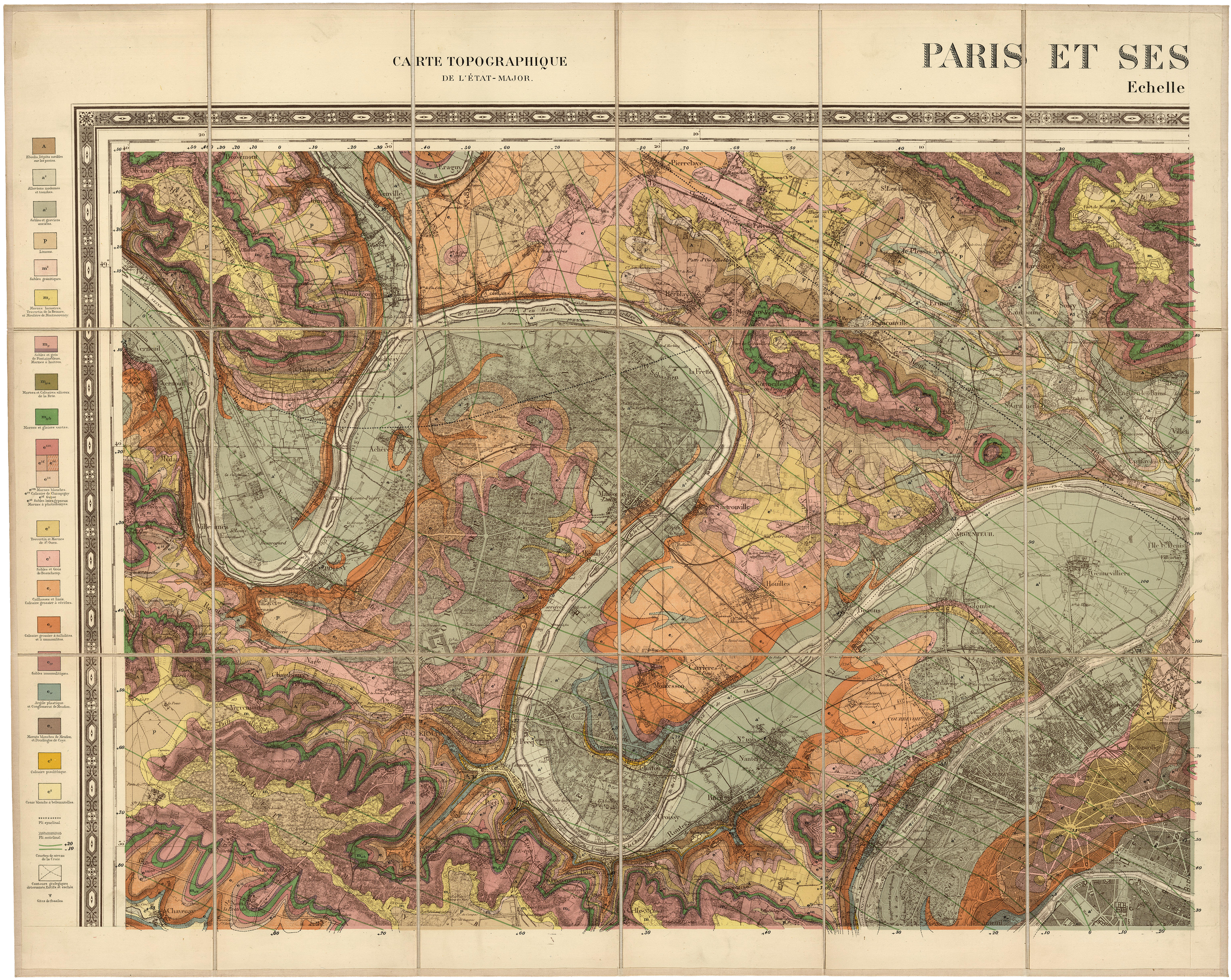 Carta topográfica del Estado Mayor. París y sus (alrededores). Escala. Leyenda: ■ Pedregales, sedimentos no consolidados en pendiente ■ Aluviones modernos y turba ■ Areniscas y grava antiguas ■ Limos ■ Areniscas graníticas ■ Margas lacustres, mármol travertino y muelas de Montmorency ▣ Areniscas y gres de Fontainebleau y margas de ostras ■ Margas y calcáreas silíceas de la Brie ■ Margas y arcillas verdes ■ Margas blancas ■ Calcáreas de Champingny ▨ Yeso ■ Areniscas yodosas y margas de Pholadomya ■ Travertino y margas de Saint-Ouen ■ Areniscas y gres de Beauchamp ■ Pedrizas y calizas, cantera de calcárea de Cerithiidae ■ Cantera calcárea de miliolitas y Nummulites ■ Areniscas numulíticas ■ Arcilla plástica y conglomerado de Meudon ■ Margas blancas de Meudon y pudinga de Coye ■ Calcárea pisolítica ■ Tiza blanca de belemnites