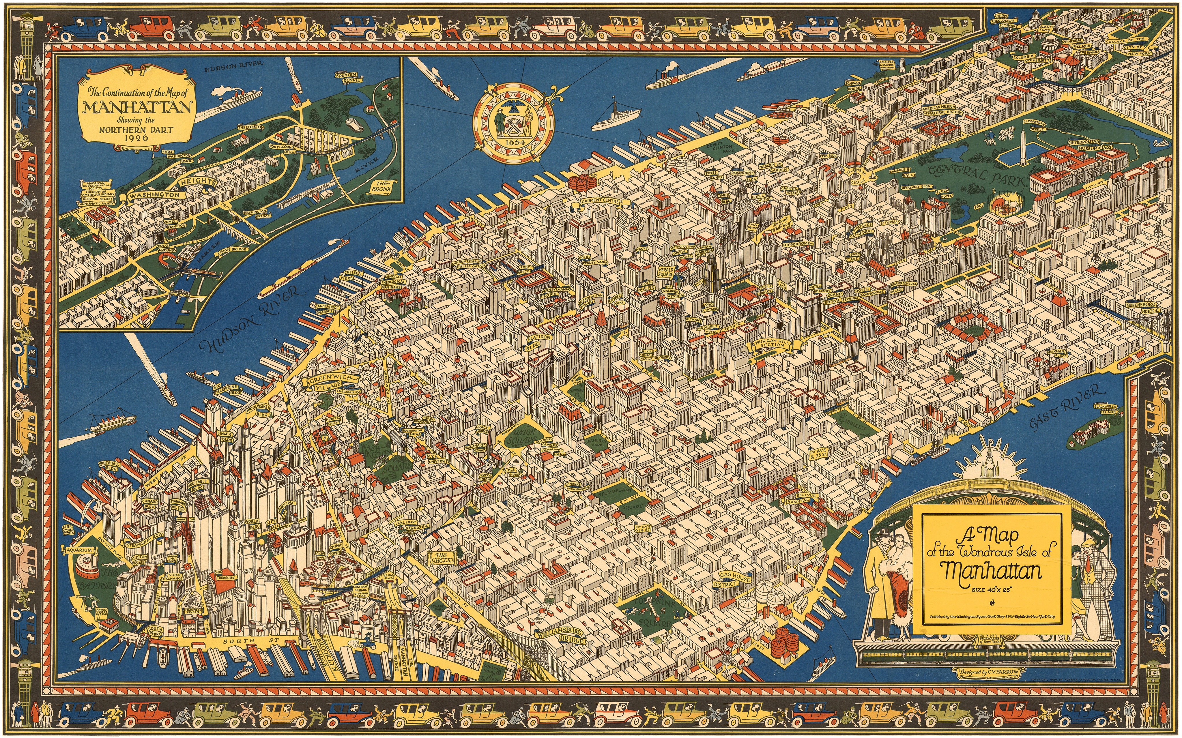 Con un magnífico nivel de detalle, este mapa de Manhattan (Nueva York) es uno de los mejores de los años 20 en los Estados Unidos. No se ha encontrado en la obra de Farrow ningún otro plano de ciudad de las dimensiones de éste, del que mostramos sólo segunda parte, del Manhattan meridional. Farrow, que murió a la edad de cuarenta años, también diseñó, en 1927, un mapamundi para Simon and Schuster, en que el que ubicaba sus actividades editoriales a lo largo del globo.
