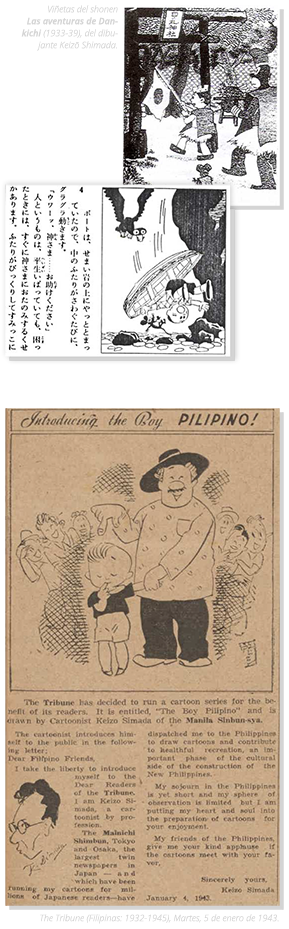 Keizō Shimada (島田啓三, Tokio, 1900-1973), principalmente autodidacta, fue un uno de los primeros mangakas que adquirieron popularidad en Japón, no sólo gracias a la repercusión de este mapa sino también a su obra como dibujante de cómics. Su trabajo serializado más leído es el shonen Dankichi el aventurero (冒險ダン吉, 1933-39), también editado por Yasutarō Satō, un manga de historias autoconclusivas (previo a la era del manga moderno, que inauguraría Osamu Tezuka en los años cincuenta, influido por las técnicas cinematográficas de Walt Disney) que adquirió gran popularidad en Japón durante la II Guerra Mundial. La obra narraba la historia de un muchacho que naufragaba en una isla del Pacífico meridional con su ratón, y acababa por convertirse en jefe de los nativos, de raza negra. Tanto Bōken Daikichi (por su promesa de dinero fácil) como alguno de los personajes que crearía más tarde, como The Boy «Pilipino» en enero de 1943, le valdrían numerosas críticas en el periodo de posguerra, siendo acusado de justificar en sus tebeos la ofensiva japonesa.