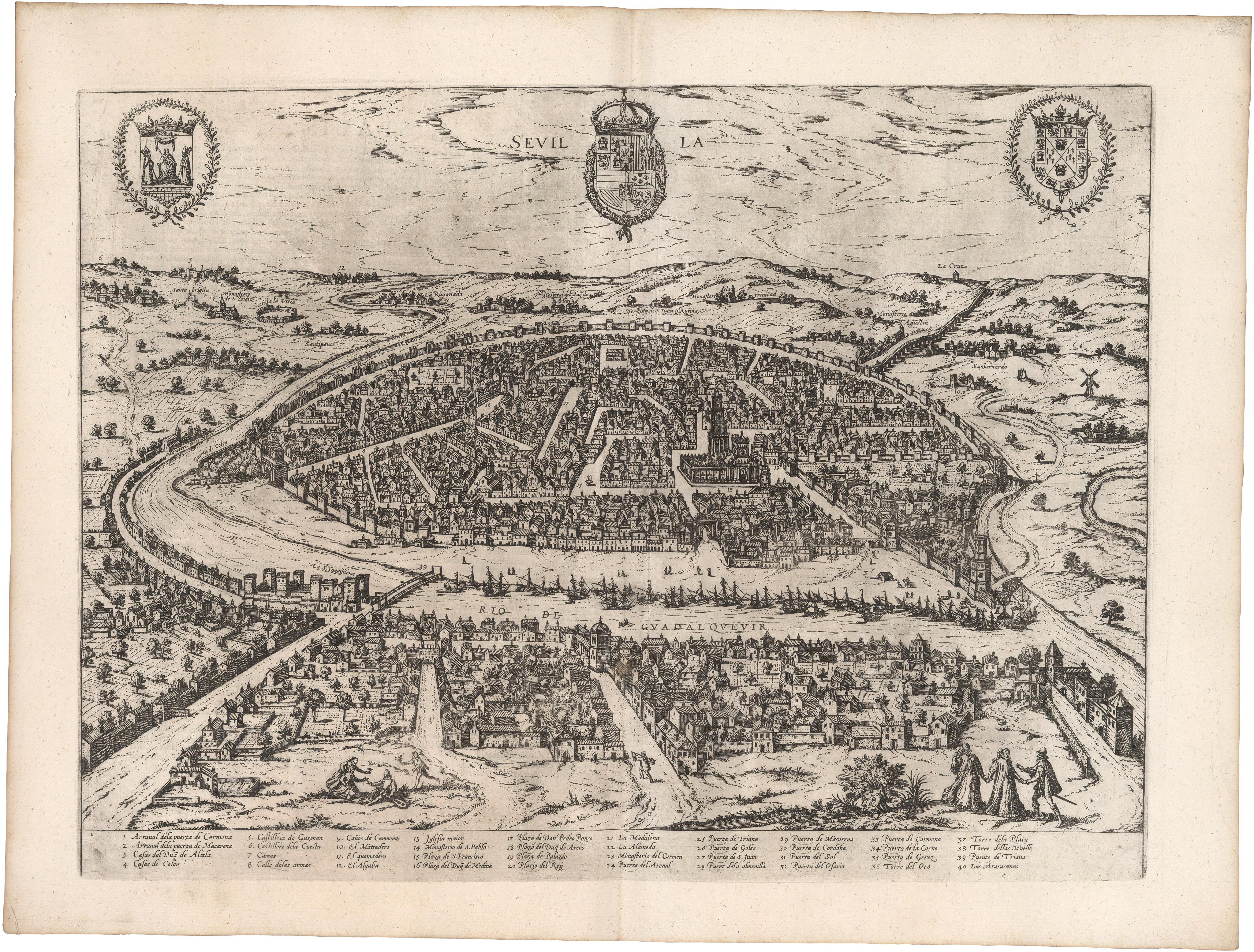 Este magnífico mapa de Sevilla forma parte del Civitates Orbis Terrarum, una obra en seis volúmenes impresa por Peter von Brachel entre 1572 y 1617, que reúne 546 planos o vistas de diferentes ciudades del mundo en 363 láminas, y está considerada como una de las más importantes de finales del siglo XVI. Aunque capitaneada por el cartógrafo y topo-geógrafo alemán George Braun (Colonia, 1541-1622) y el grabador a buril, aguafuerte y cartógrafo flamenco Frans Hogenberg (Malinas, c. 1535-Colonia, 1590), en la creación de los libros participaron un gran número de escritores, grabadores y artistas. Según Ronald Vere Tooley, importante comerciante de mapas del siglo XX, la obra constituye el primer intento a tener en cuenta que proporcionaba representaciones gráficas de las principales ciudades del mundo, cuyos edificios más emblemáticos fueron dibujados en el lugar. Además, los editores ofrecían junto a estas vistas información de valor, como las armas heráldicas de la ciudad y la naturaleza de los alrededores, si eran boscosos o cultivables, tierra de pastoreo, viñedos o jardines. La importancia de las vías fluviales se concreta en lo cuidadosamente que están delineado los puentes de piedra, los pontones de madera o los botes de fondo plano. También hay referencias al tráfico marítimo y terrestre en puertos y caminos, a la constitución legal del territorio o incluso al modo de vestir de sus habitantes. La intención primera no era producir paisajes bien balanceados, sino condensar tanta información como fuera posible de una forma agradable a la vista, a modo de guía total.