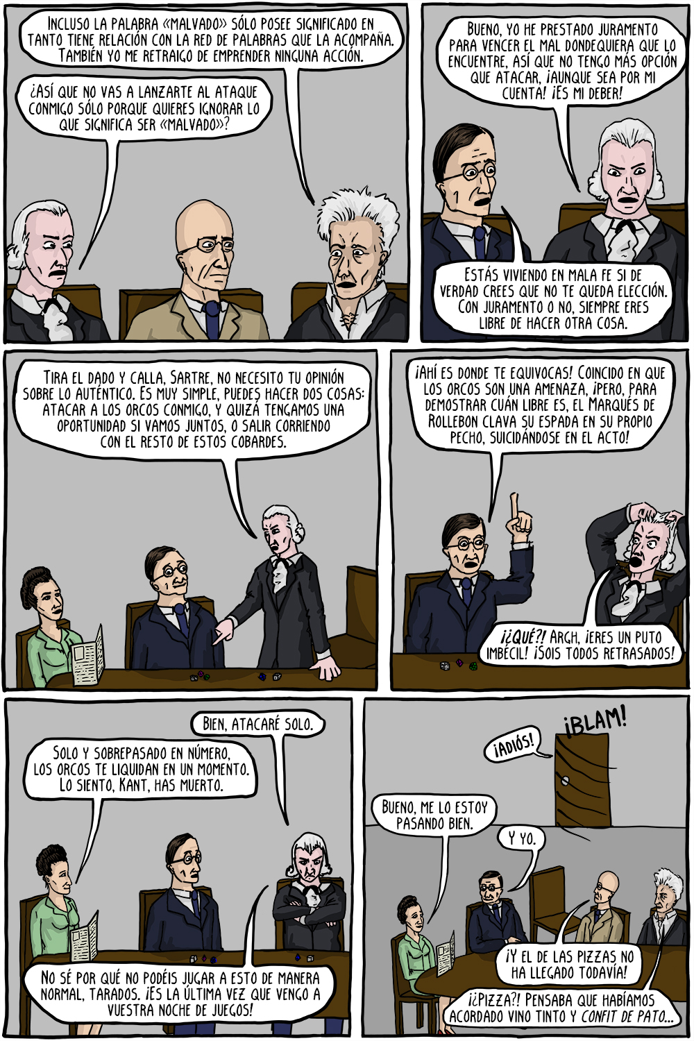 La parte de Sartre se refiere a la fenomenología, el estudio de las estructuras de la experiencia. A través de Husserl, Sartre comenzó a poner entre paréntesis (es decir, a dejar de lado) cuestiones metafísicas como la existencia del mundo exterior u otras mentes, para centrarse en la experiencia en sí misma. Si dispusiera de más espacio podría decir que porta el «amuleto de Husserl de la fenomenología», ya que el concepto está más ligado a Husserl. Su diálogo con Kant gira en torno a la idea de que vivimos en «mala fe» (mintiéndonos a nosotros mismos, básicamente), pues negamos nuestra libertad intentando seguir las reglas implacables que debemos seguir, como si hubiéramos prestado juramento previo.